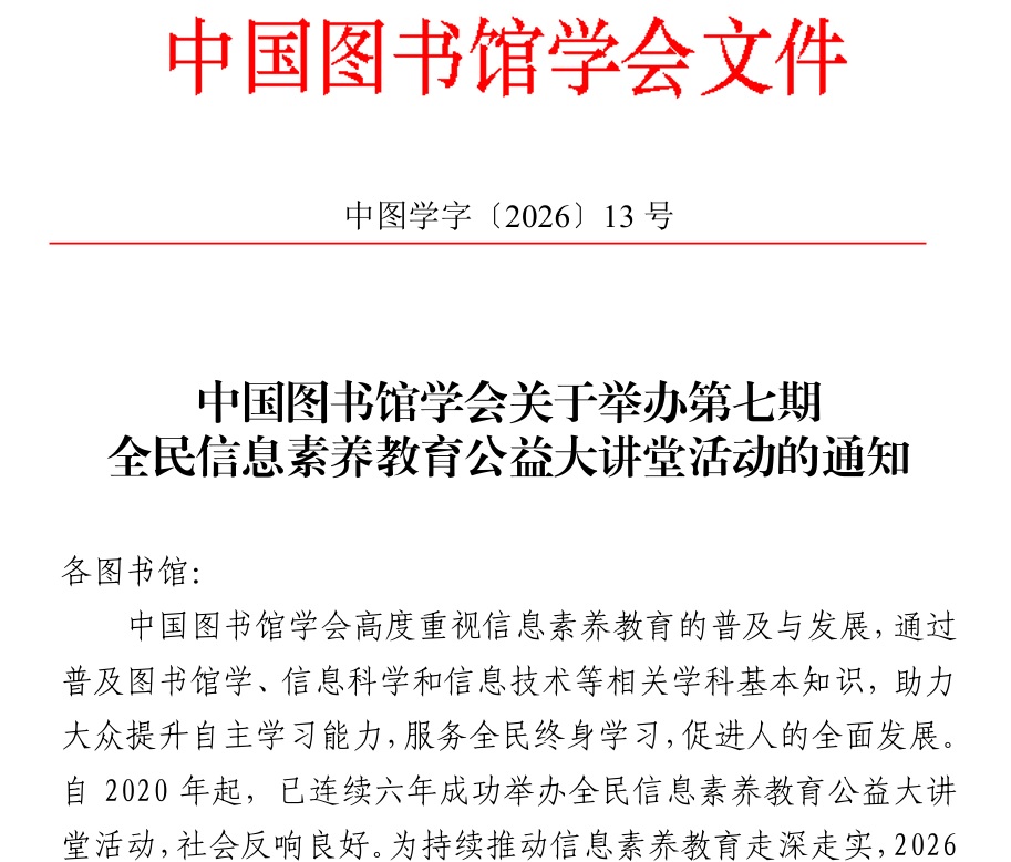 中国图书馆学会关于举办第七期全民信息素养教育公益大讲堂活动的通知